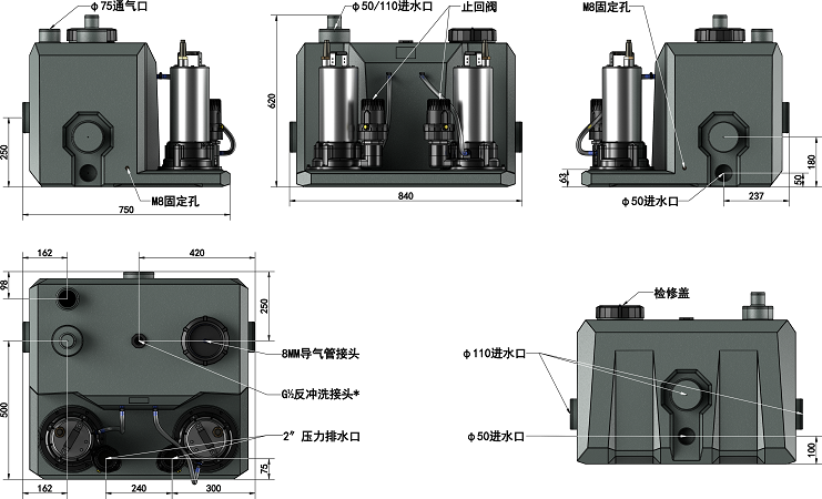 ·  入水口:3×φ110,3×φ50,1×φ50/110